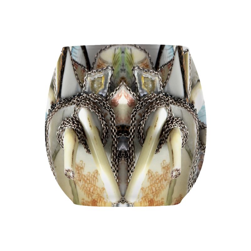 Designer glass tea light holders inspired by the 'In the woods' brooch within Liana Pattihis's art jewellery collection "Scentimental". They are 6cm tall, come with a white unscented tea light and can be bought as a pack of three identical tealight holders.