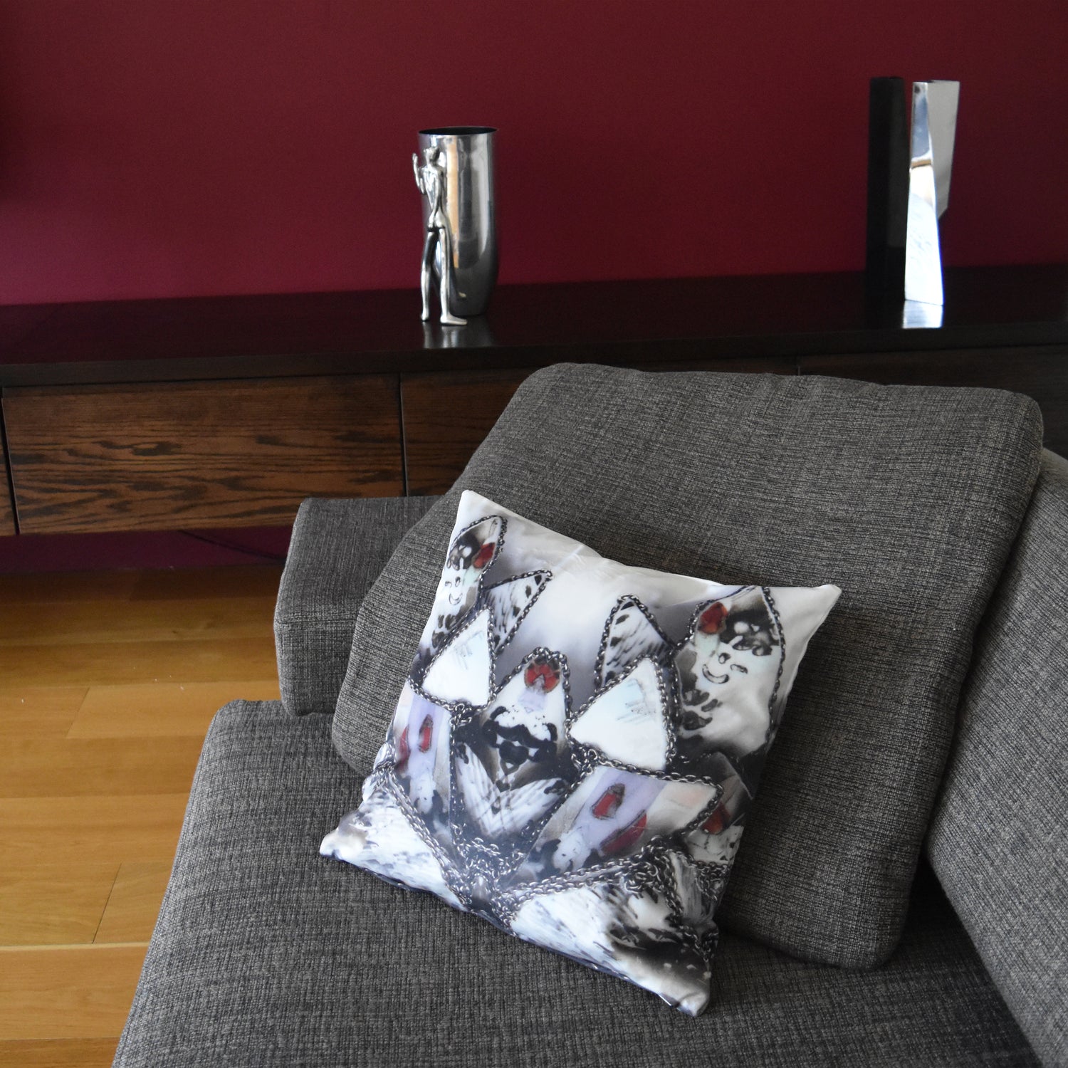 Designer cushion inspired by the "My body is my Temple" brooch within Liana Pattihis's art jewellery collection "Scentimental". It comes in two sizes 30cm x 30cm and 40cm x 40cm square. It is printed with the same image, both front and back.