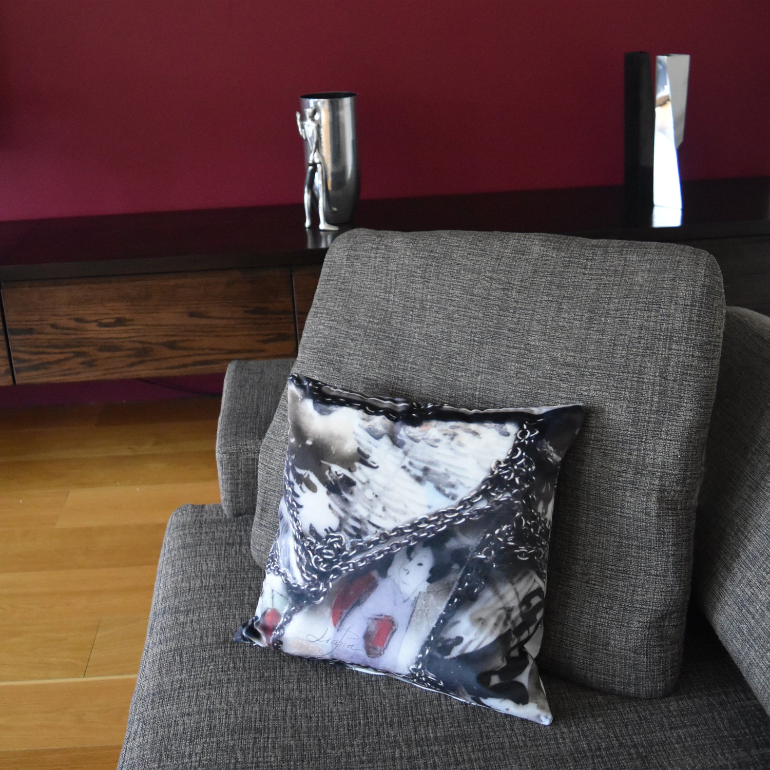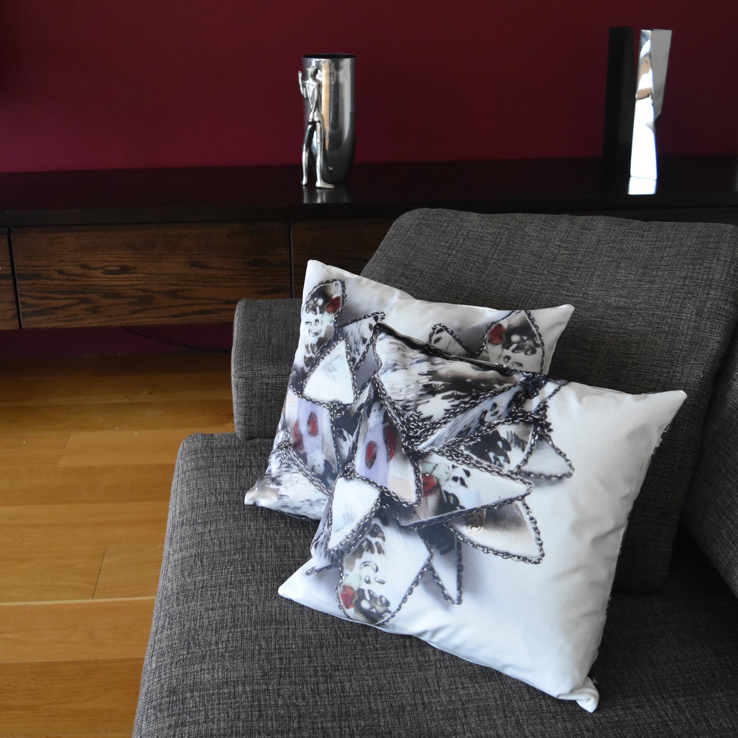 Designer cushion inspired by the "My body is my Temple" brooch within Liana Pattihis's art jewellery collection "Scentimental". It comes in two sizes 30cm x 30cm and 40cm x 40cm square. It is printed with a different image at the back.