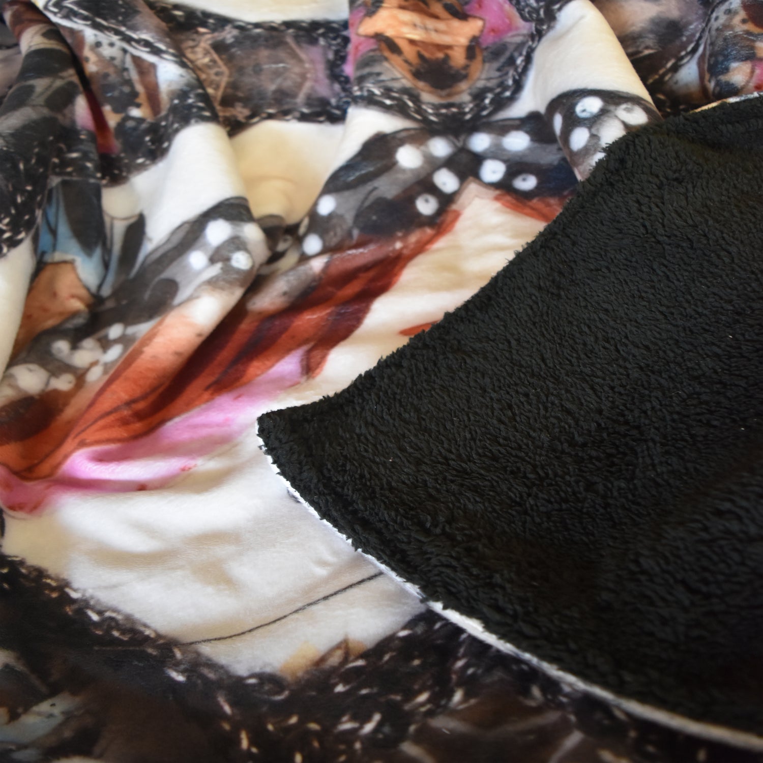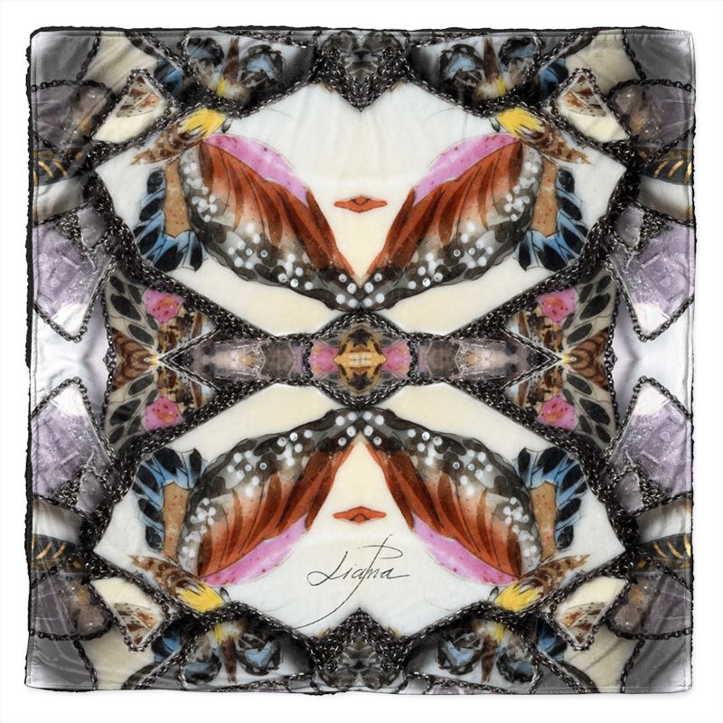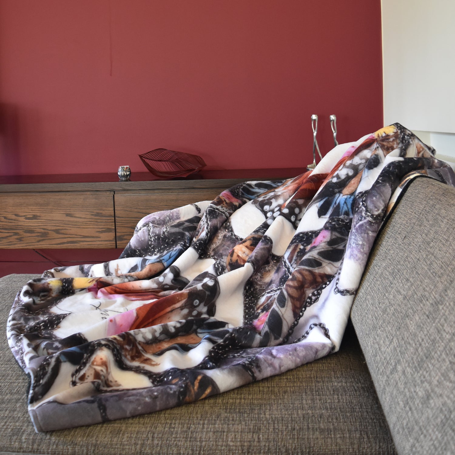 Designer throw inspired by the 'Social Butterfly' brooch within Liana Pattihis's art jewellery collection "Scentimental". Comes in a 145cm x 145cm size, a plush velvet printed front, with a choice of either beige or black soft sherpa fleece back.